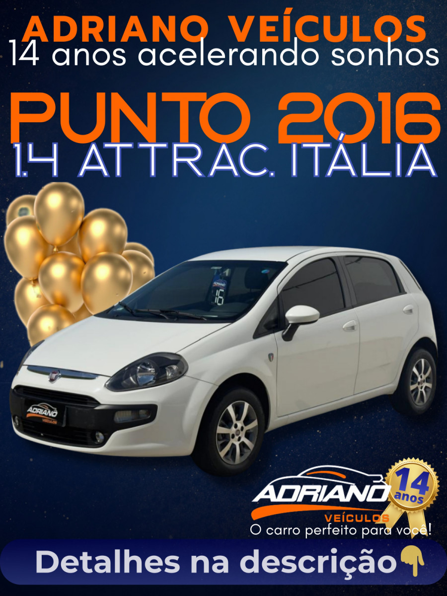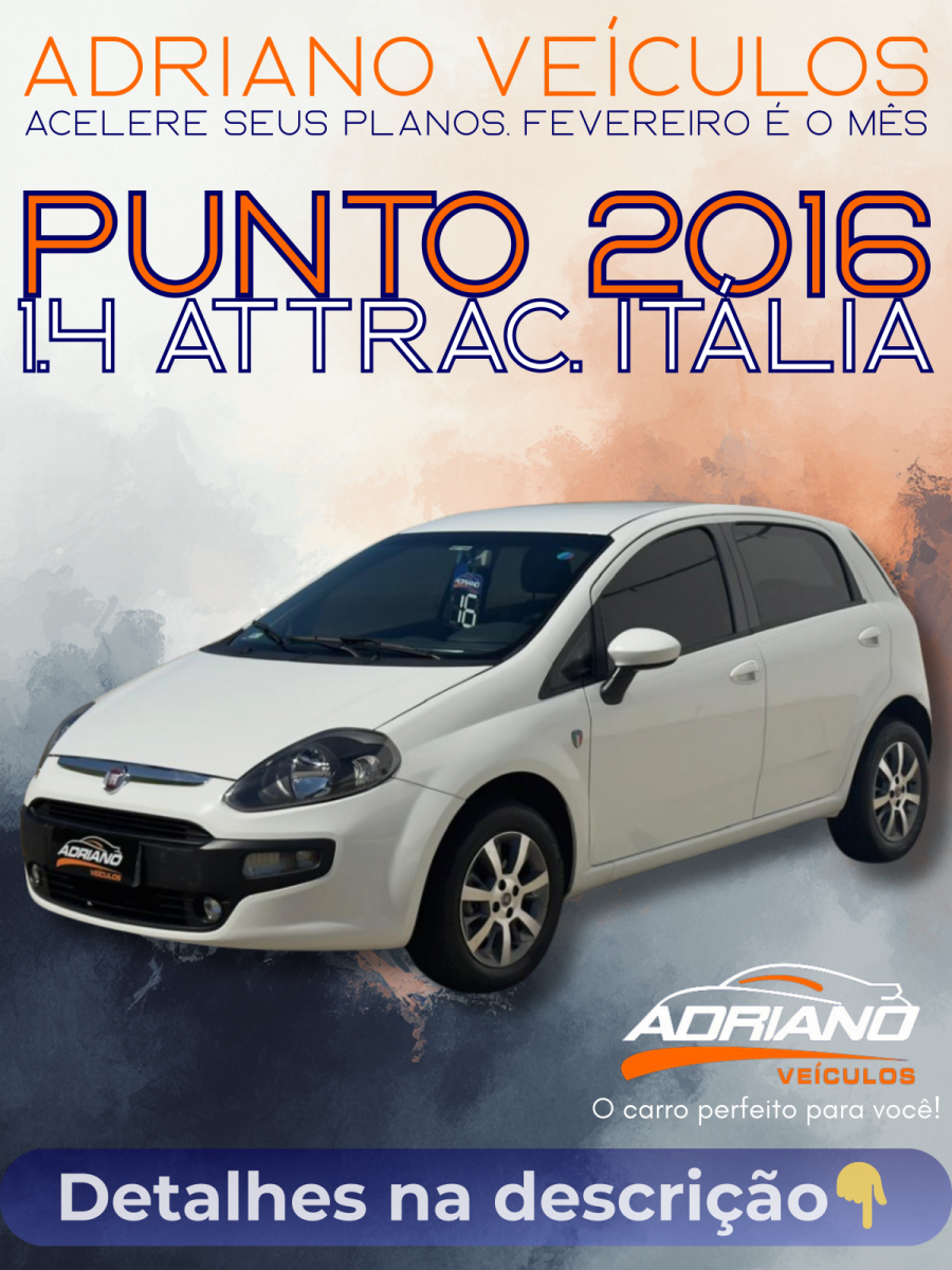 O Punto se destaca pelo visual esportivo e ótimo acabamento interno. Esta unidade conta com o pacote Série Itália, que adiciona itens de estilo e valoriza ainda mais o veículo. Destaques do veículo: * Série Itália: Acabamento diferenciado e Rodas de Liga Leve exclusivas da versão. * Motor 1.4 Fire: Mecânica confiável, econômica e de manutenção acessível. * Quilometragem: 102 mil km rodados. * Conforto: Completo com ar-condicionado, direção hidráulica e vidros elétricos. * Praticidade: Equipado com sensor de estacionamento traseiro. * Segurança: Freios ABS e Airbag Duplo. Um hatch com presença, conforto e visual diferenciado. Qualidade e procedência Adriano Veículos.