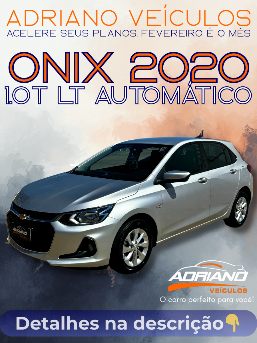 Procurando um carro moderno, ágil, super econômico e com todo o conforto do câmbio automático? Sua busca acaba aqui! Este Chevrolet Onix LT 2020 é a escolha inteligente para quem quer o melhor dos dois mundos: a performance divertida do motor turbo e a praticidade para o dia a dia na cidade. Um dos hatches mais completos e seguros da categoria, pronto para te surpreender! * Motor 1.0 Turbo com Câmbio Automático de 6 velocidades * Segurança em Primeiro Lugar: 6 Airbags (frontais, laterais e de cortina) e Freios ABS * Conectividade: Central Multimídia MyLink com espelhamento para seu smartphone * Design e Conforto: Rodas de Liga Leve e Sensores de Estacionamento * Completo: Ar-condicionado, Direção Elétrica, vidros e travas elétricas. Um dos carros mais queridos e premiados do Brasil, conhecido pelo baixo consumo de combustível e pela excelente dirigibilidade. Uma oportunidade única com a procedência e a qualidade que só a Adriano Veículos pode oferecer. Não deixe essa chance passar! O Onix Turbo é um sucesso absoluto e unidades automáticas como esta são disputadíssimas. Gostou? Entre em contato agora mesmo pelo nosso WhatsApp e venha fazer um test-drive!