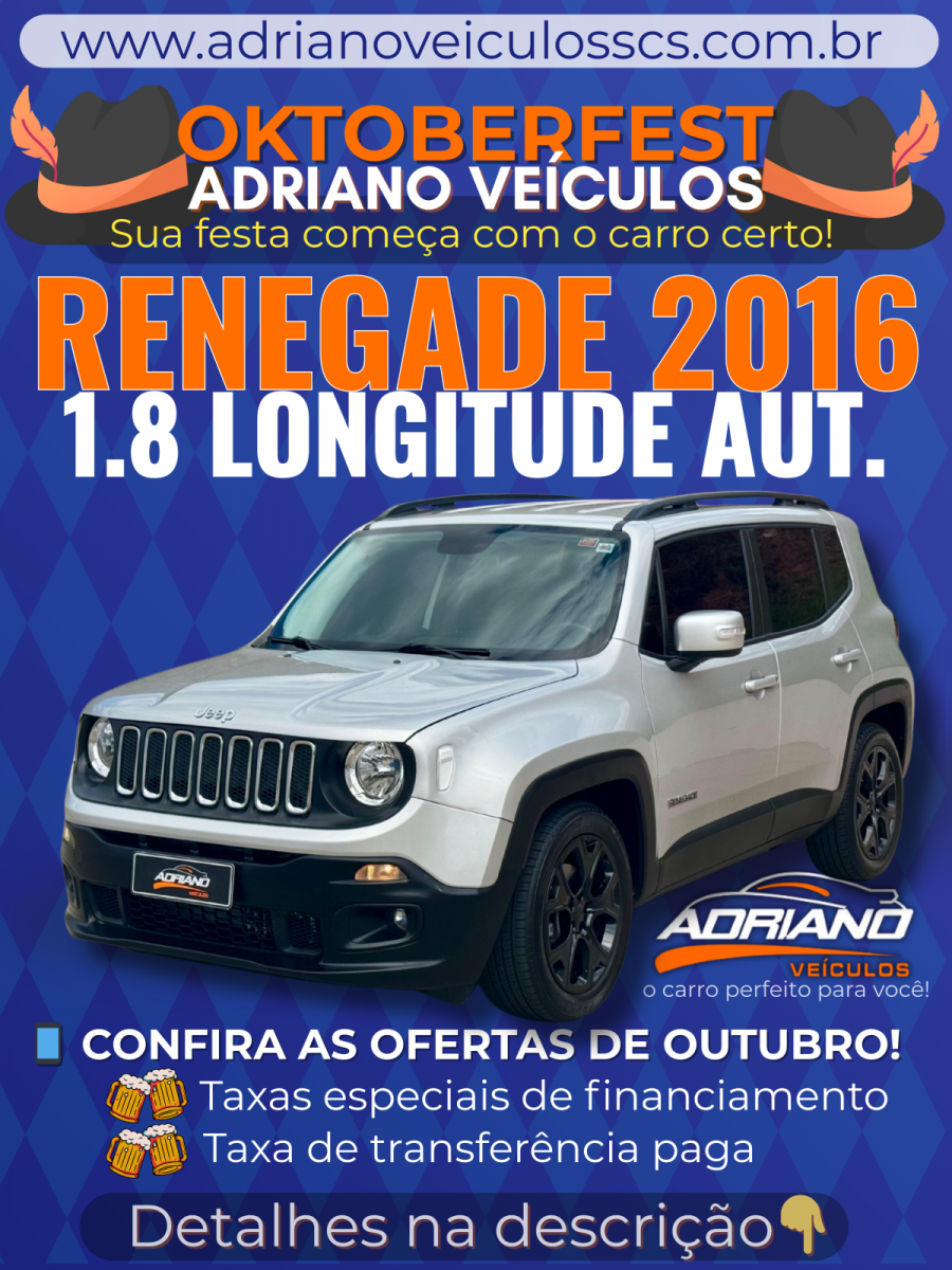 APENAS 83 MIL KM RODADOS + COMPLETÍSSIMA! O Renegade Longitude 1.8 Automática 2016 é a escolha ideal para quem busca uma SUV com design marcante e interior premium. Completamente equipada e com baixa quilometragem, é perfeita para suas aventuras urbanas e viagens, garantindo o máximo de conforto e tecnologia. * Apenas 83 mil km rodados * Completíssima * Câmbio automático * Bancos em couro * Multimídia com câmera de ré * Rodas de liga leve * Airbag * Freios ABS Financiamento facilitado Entre em contato e venha conhecer seu próximo SUV aventureiro! Sua chance de ter uma Renegade pronta para novas experiências!