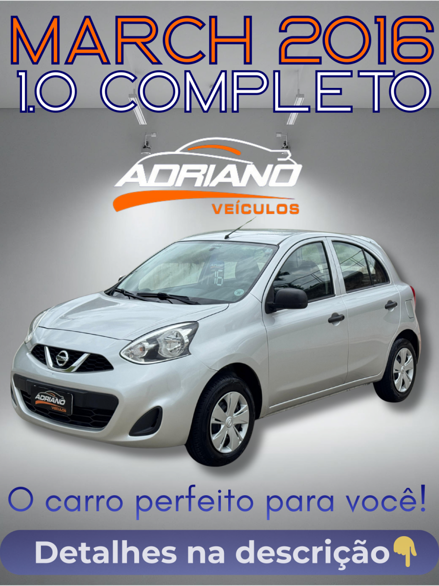 A escolha inteligente para quem busca um carro prático, confiável e muito econômico para a rotina diária. Este Nissan March 2016 é a combinação perfeita de agilidade para a cidade e baixo custo, com o conforto extra da direção elétrica. Confira os diferenciais: * Direção Elétrica * Motor 1.0 Super Econômico * Completo de Fábrica: Com ar-condicionado, vidros e travas elétricas. * Segurança: Airbag duplo e freios ABS * Apenas 105 mil km rodados! Um hatch versátil e bem cuidado, com a procedência e garantia da Adriano Veículos. A oportunidade perfeita para o seu primeiro carro ou para quem quer um veículo ágil para o dia a dia. Não deixe essa chance passar. Fale conosco e agende sua visita!
