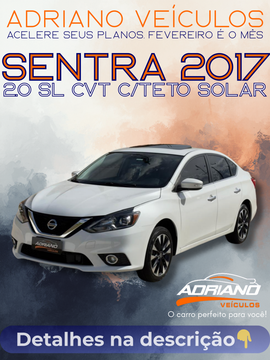 Esta é a configuração mais desejada do Sentra: a versão SL equipada com Teto Solar. Um sedan que une o conforto de rodagem da Nissan com a exclusividade de um acabamento topo de linha. Destaques desta unidade: * Teto Solar Elétrico: O diferencial que traz mais luminosidade, ventilação e sofisticação ao veículo. * Versão SL (Top de Linha): Acabamento refinado, com detalhes cromados e rodas de liga leve exclusivas. * Interior em Couro: Bancos confortáveis e elegantes, em perfeito estado. * Tecnologia: Chave presencial (Start/Stop) e Central Multimídia com Câmera de Ré e GPS. * Segurança Total: Airbags Frontais e Laterais + Freios ABS. * Praticidade: Sensor de estacionamento e câmbio automático CVT. Um carro completo, seguro e com o status que você procura. Procedência e qualidade Adriano Veículos. Venha conferir esse sedan exclusivo de perto.